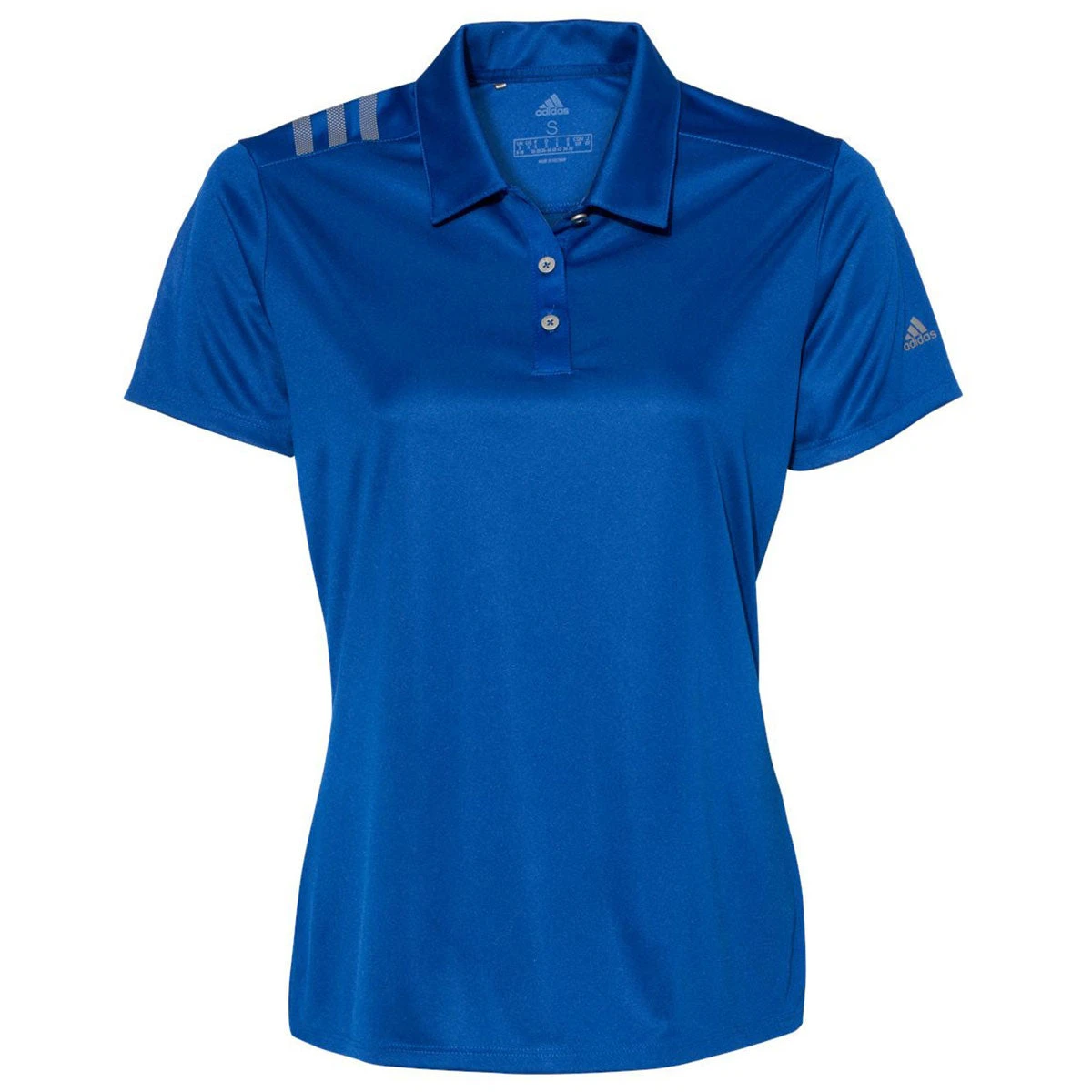 Get noticed in a custom Adidas Women’s Collegiate Royal/Grey 3 Stripe Shoulder Sport Polo. The unique look of this 100% recycled polyester jersey polo type shirt with hydrophilic finish will turn heads whether used as employee apparel or just to build a personal wardrobe. Available in a range of colors and sizes, these polos can be embroidered with a corporate logo or custom design of your choosing. The self-fabric collar and three button placket create a professional look as corporate apparel or can be chosen for a day spent with friends. Place an order right away to have these ready to go for your next big event.