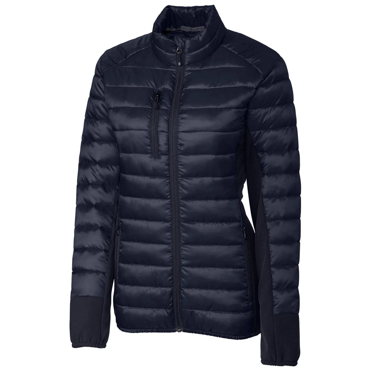 - 100% Polyester Quilted hybrid with colorblock softshell side panels