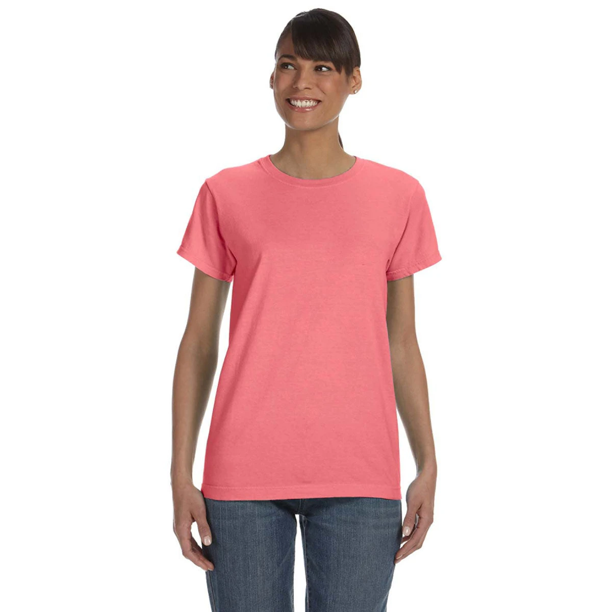 Decorated with a custom logo, the Comfort Colors Women’s Watermelon 5.4 Oz. T-Shirt offers you fashion flexibility. Wear the smooth feeling tee as your company’s team uniform for corporate softball tournaments. Put the 100% ring spun cotton t-shirt on as the first layer that protects you against Old Man Winter’s icy blasts. Double needle stitching at the collar, sleeves, and bottom hems bolsters the durability of the cotton designed ladies tee. The semi-fitted silhouette creates an attractive appearance that will turn heads at outdoor civic events. Twill taped neck and shoulders produce a seamless blending of the rugged fabric.