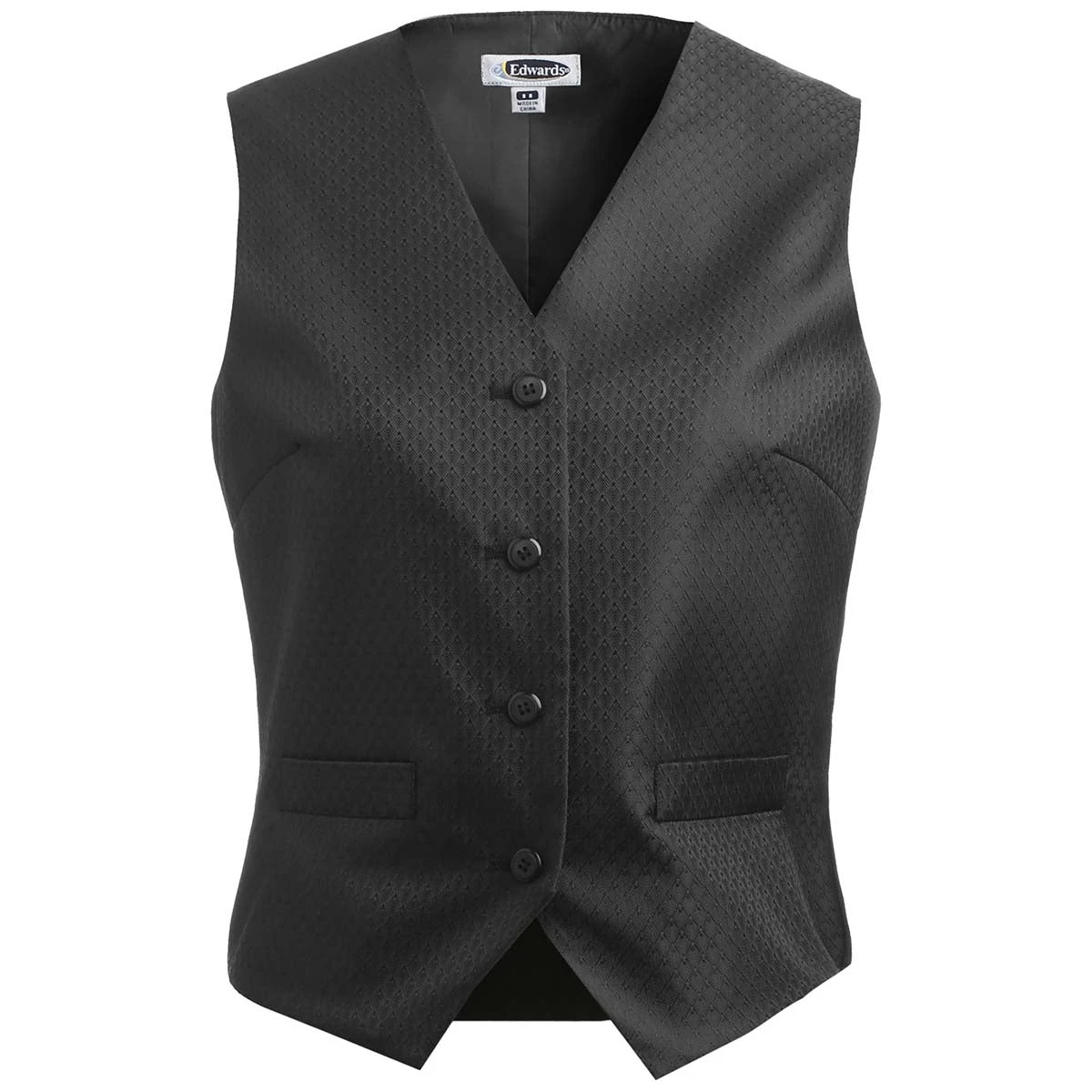 Create a truly custom look with the Edwards Women’s Black Diamond Brocade Vest in either black or gold. Perfect to wear alone or under a jacket, these bold vests work well as employee apparel for those serving or working at banquets, casinos, or restaurants where a certain flair needs to be established. Add a company logo to use as corporate apparel with the vests that offer two inside lining pockets, black buttons on the placket, and a 100% polyester fabric that will stand up to long nights. This festive diamond brocade vest is a must have in the entertainment and service industries, place your order today.