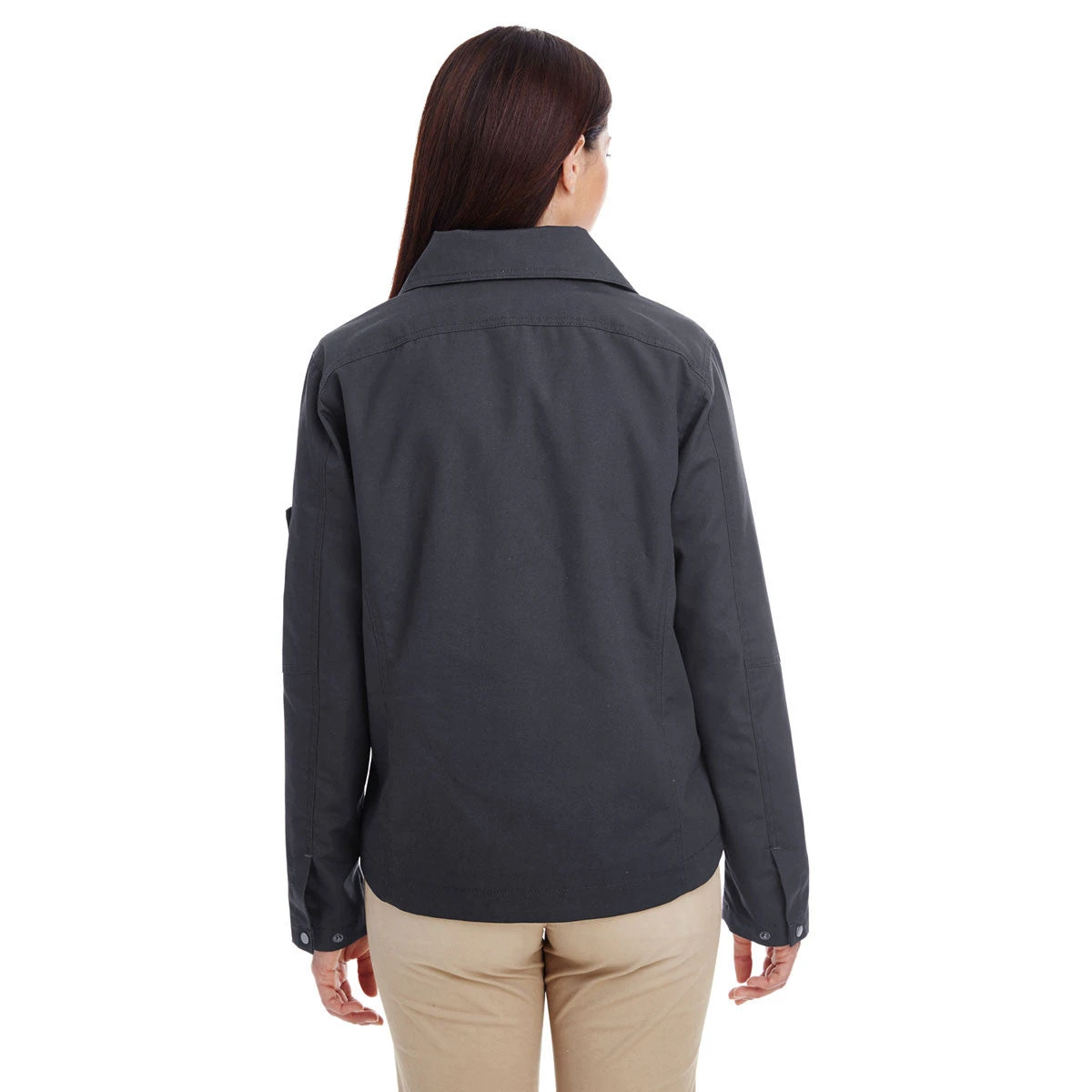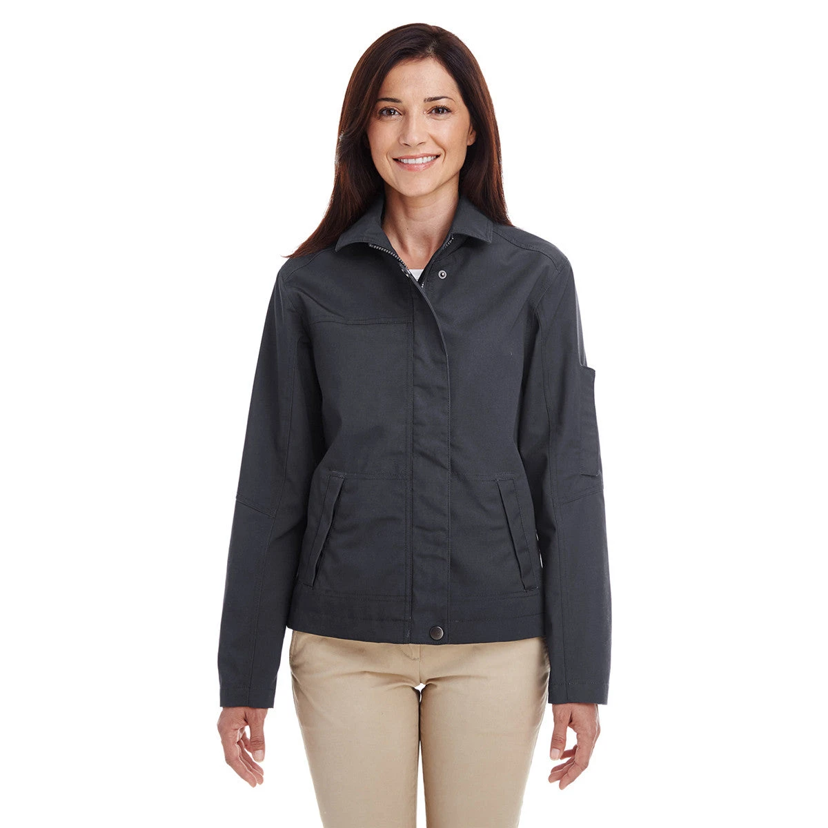 Rugged 80% polyester and supple 20% cotton pack a powerful one-two fashion punch for the Harriton Women’s Dark Charcoal Auxiliary Canvas Work Jacket. The work jacket includes a water resistant shell that keeps the women on your team dry during extended stints in the field. Fold down the collar to expose the highly protective storm placket. Back princess seams creates a flattering feminine fit. Adjustable cuffs allow you more arm movement flexibility at play or on the job. Use the inner pocket with a hook and loop closure to store a Smartphone. Add your company logo to spread the word about your brand.