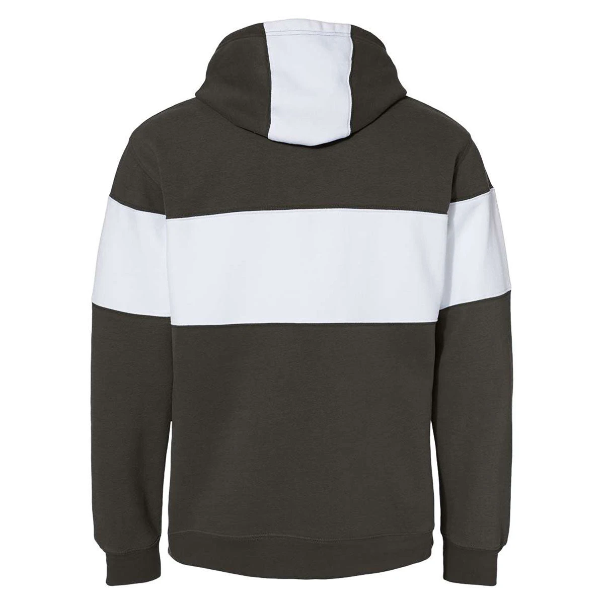 Stand out with embroidery on the J. America Men’s Black Varsity Fleece Colorblocked Hooded Sweatshirt. Choose a custom logo to create team or warm-up gear that will get noticed with a solid bottom, top and shoulders and large colorblocked stripe across the chest. A drawstring hood with contrasting drawstring protects from the wind when needed on this easy to layer hooded sweatshirt that nearly anyone can enjoy. Ideal as an employee gift with a company logo or a custom gift for friends, this sweatshirt makes those long days at home, outdoors, or running errand much more comfortable.