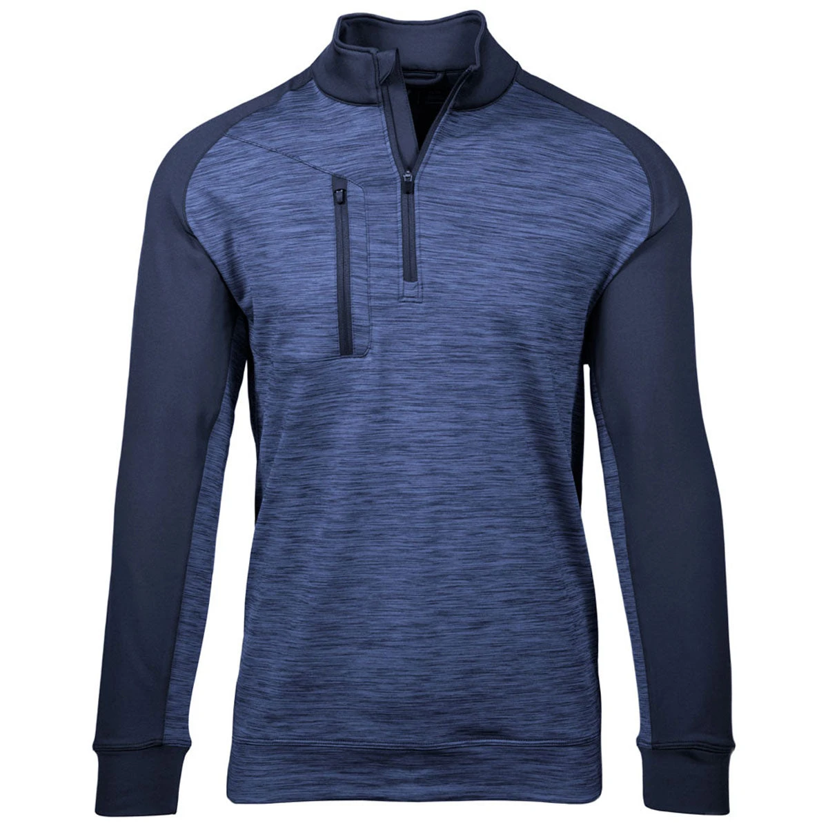 Add a custom logo to the sleek and stylish Levelwear Men’s Navy Rampart Quarter Zip Pullover for the ultimate in athletic or athleisure wear. The two toned long sleeve design is fitted to be worn alone or over a lighter top for added protection. The Quarter Zip front has a solid core area with contrasting sleeves, shoulder, and mock collar, as well as zippers. Ad d accompany logo to give as employee gifts or use as uniforms for those who work in the health and wellness industries. A vertical chest pocket zips closed for convenience to protect small items you need no matter what you are doing. Place an order today.