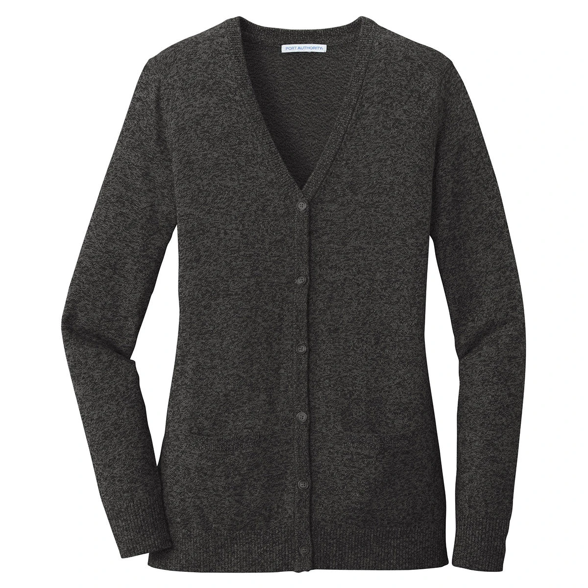Designed to highlight your company or team, the chic Port Authority Women’s Black Marl Marled Cardigan Sweater contains a large area to add your embroidered logo. Hand out the sweater at corporate recruiting events to leave a positive lasting impression on the most talented job candidates. The two-tone design allows you to mix and match the sweater with different outfit choices. Wear the layering piece over a long sleeve work shirt, as well as under a winter jacket to generate plenty of warmth. Super soft cotton blends with rugged acrylic to cover all the fashion bases. Your employees will appreciate receiving a piece of embroidered apparel that is versatile and comfortable for continued use.
