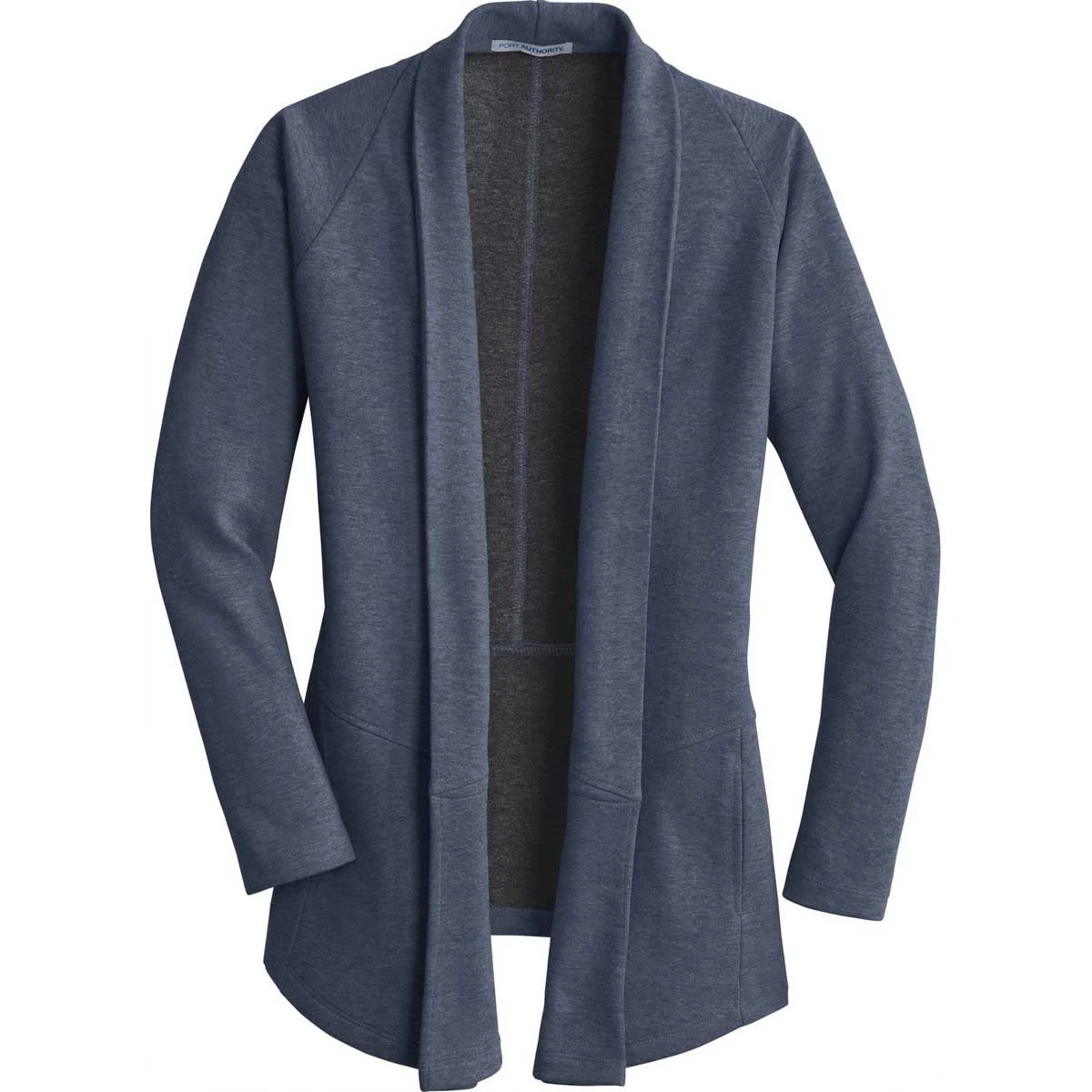 When you want to make a stylish fashion statement, putting on a cardigan sweater typically presents a clear message that you’re serious about your wardrobe. However, you haven’t made a strong cardigan fashion statement until you put on the Port Authority Women’s Estate Blue Heather/Charcoal Heather Interlock Cardigan. The lightweight cardigan contains two attractive interlocked colors that complement the rest of your outfit. Raglan sleeves and a shawl collar punctuate the sleek design of a cardigan that provides you with fashion versatility. Attach your corporate logo to the cardigan and watch awareness of your company soar.